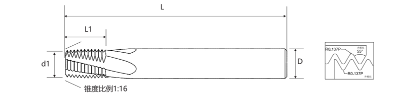 Imperial BSPT (PT.RC) 55° Post Milling Cutter ISO signa 7-1 conformat et ad machinationem BSPT 55° stamina fistulae attenuata destinatur, quae late in nexus et applicationes signandi usi sunt. Dissimilis BSP G (stamina fistulae parallela), fila BSPT habent angulum stamina 55° et proportionem ceream 1:16, securum obtinens sigillum per sequelam pugnae et proprietates sui ipsius densis.